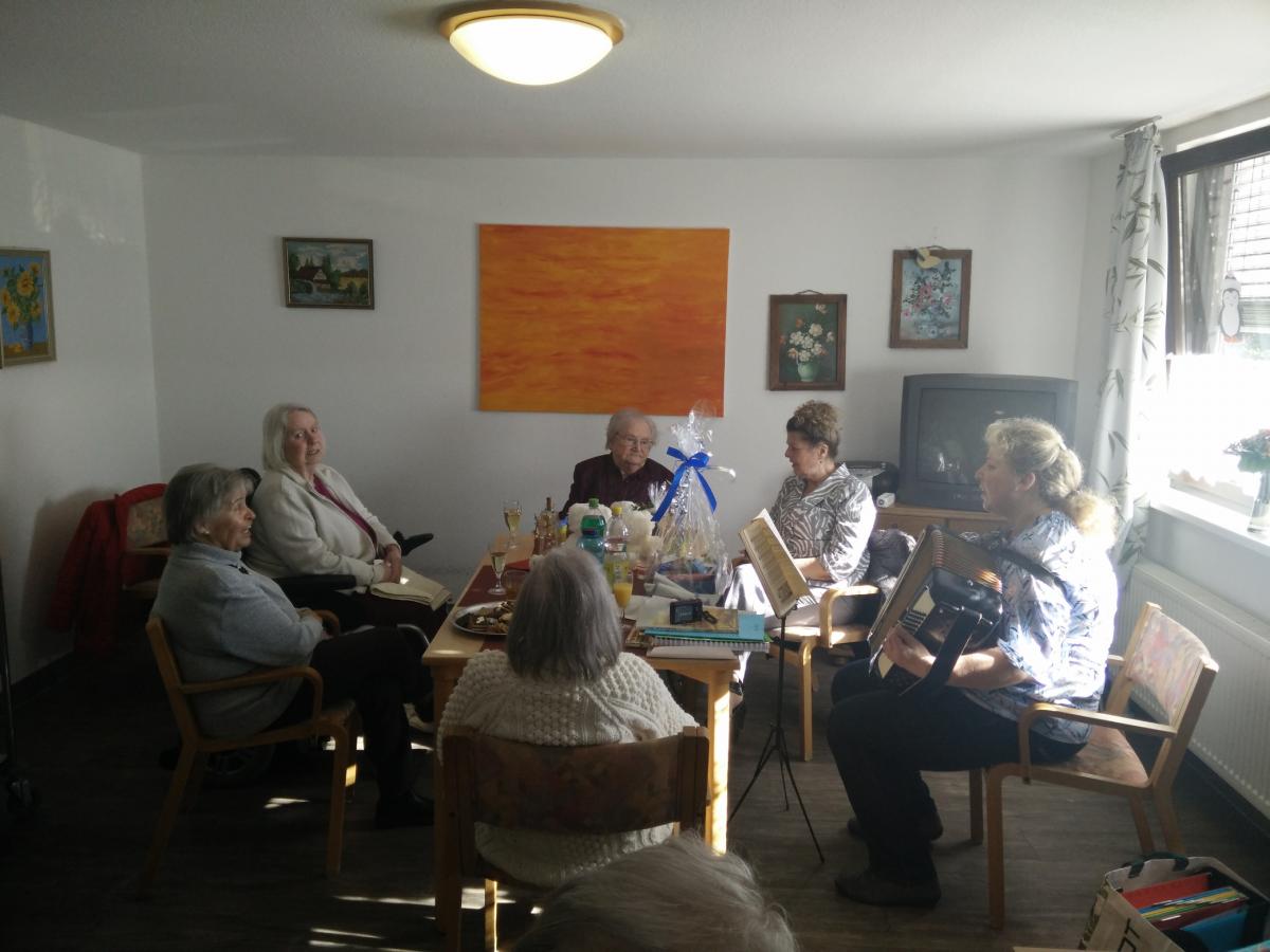Es war ein ganz besonderer Sonntag für Frau Gertrud Herhold an diesem 24. Februar 2019. An diesem Tag feierte die Bewohnerin des Seniorenpflegeheims Maria im Tann ihren 101. Geburtstag. Ihr Ehrentag hatte sich schnell im Haus herumgesprochen und so erhielt sie schon am Vormittag von der 1. Vorsitzenden der Bewohnervertretung Margot Gleiß und ihren Mitbewohnern persönliche Glückwünsche überreicht. Betreuungskraft Michaela Kobschätzky spielte ihr ein Geburtstagsständchen auf dem Akkordeon bei dem fleißig mitgesungen wurde.