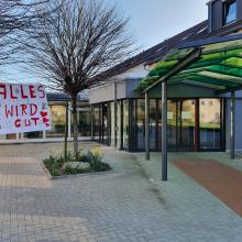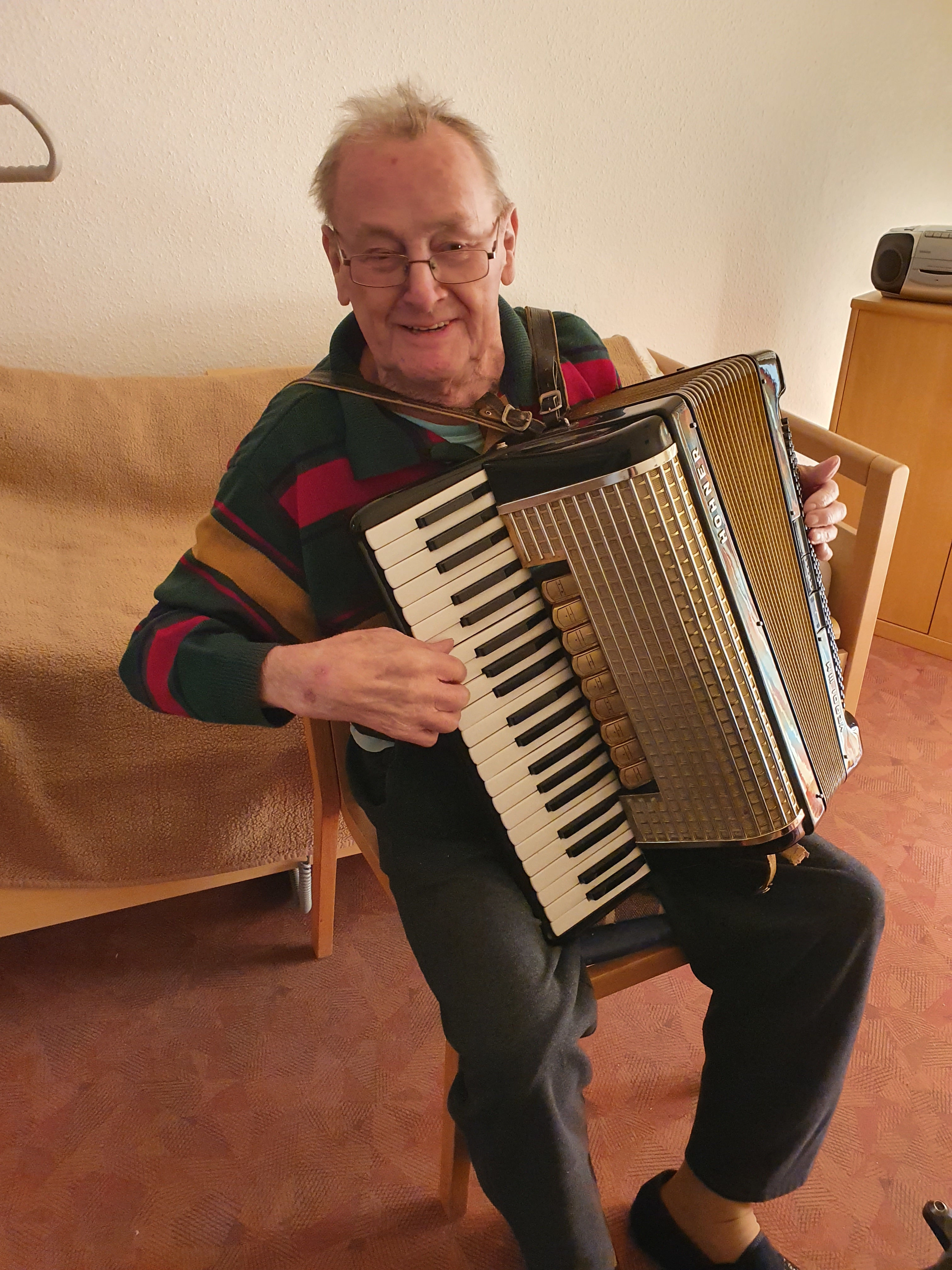 Auch unsere Bewohner spüren die Veränderungen der aktuellen Situation. In den jetzt sehr kleinen Gruppenstunden haben sie als „Zeichen an die Außenwelt“, einen Banner mit der Nachricht „Alles wird gut!“ kreiert. „Langeweile habe ich nicht“ sagt Bewohner Heinrich Goßmann, er nutzt die Zeit ohne Besuch und spielt gut gelaunt Akkordeon.