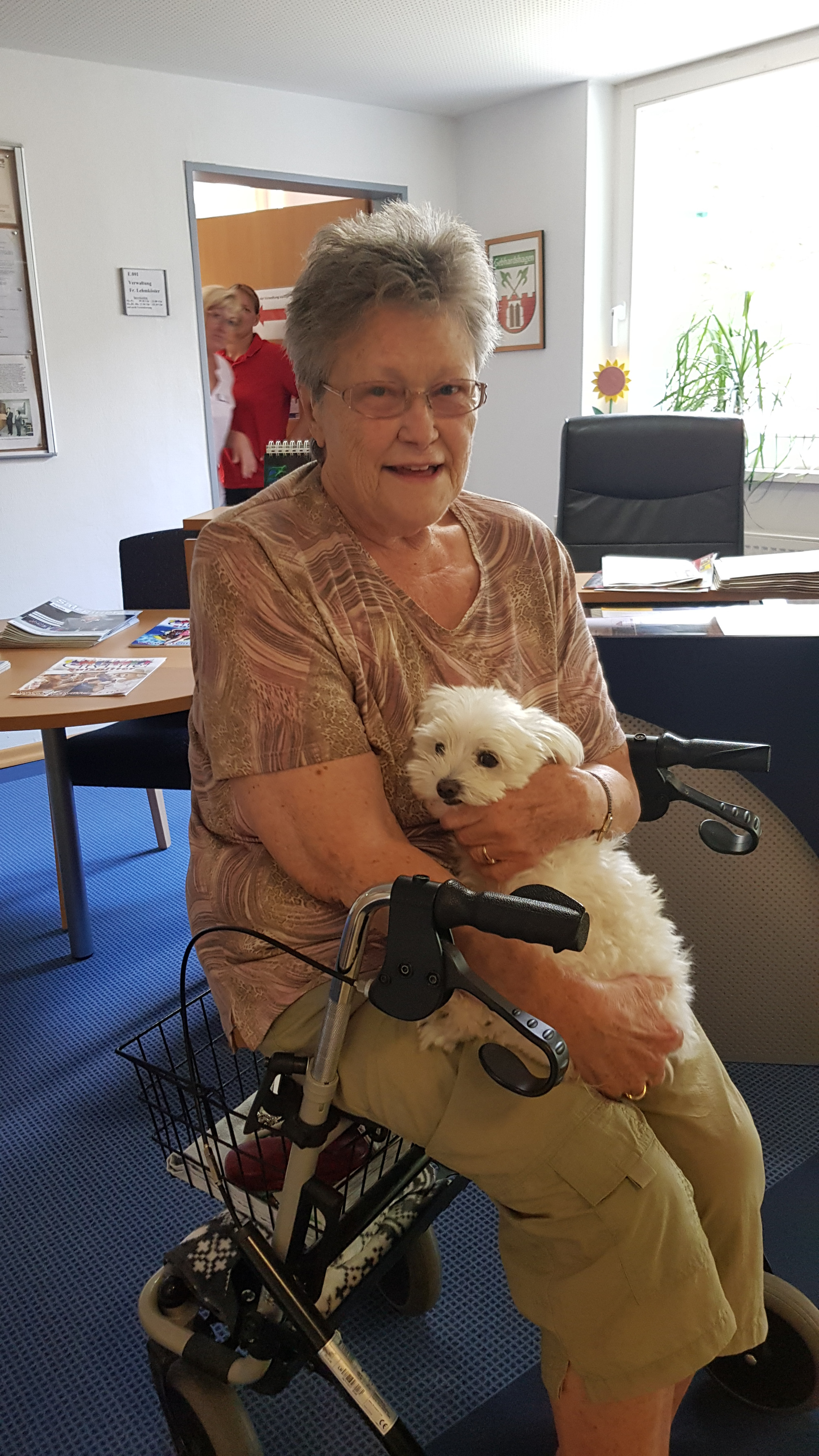An manchen Tagen begleitet unsere Verwaltungsangestellte Birgit Lehmköster ihr Hund Pitú in das Pflegeheim. Viele Bewohner schauen an diesen Tagen besonders gern bei ihr vorbei um den vierbeinigen Gast zu begrüßen. So auch Bewohnerin Doris Kleinert, die den Mini Malteser sofort ins Herz schloss, und ihn kurzerhand auf ein gemeinsames Mittagsschläfchen einlud. Zusammen verbrachten die beiden einen ruhigen Nachmittag die mit einem Spaziergang endete. Freudestrahlend berichtete Frau Kleinert noch am nächsten Morgen „Das war der schönste Tag meines Lebens“.