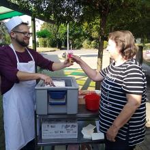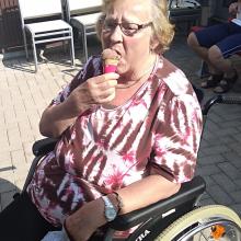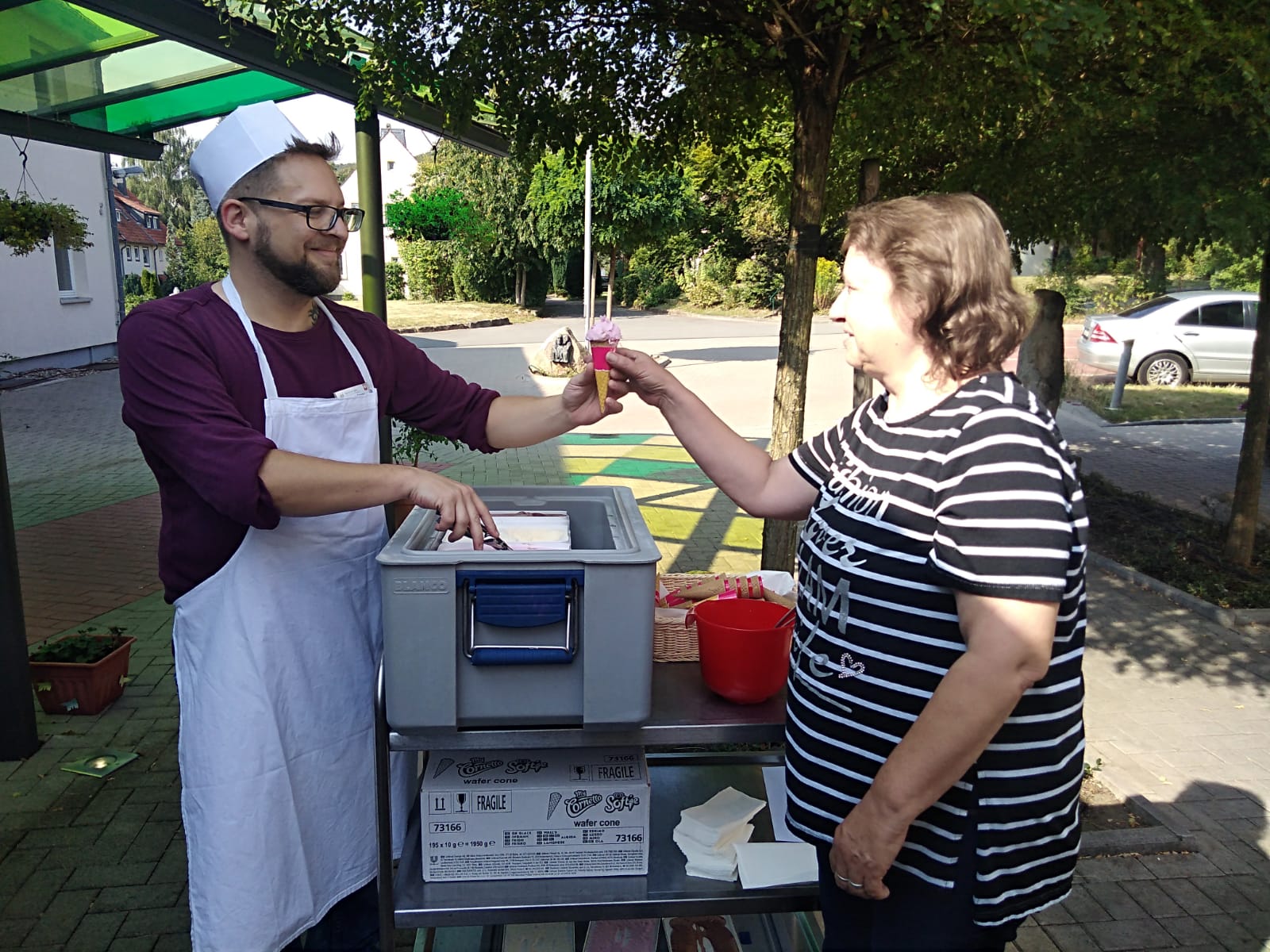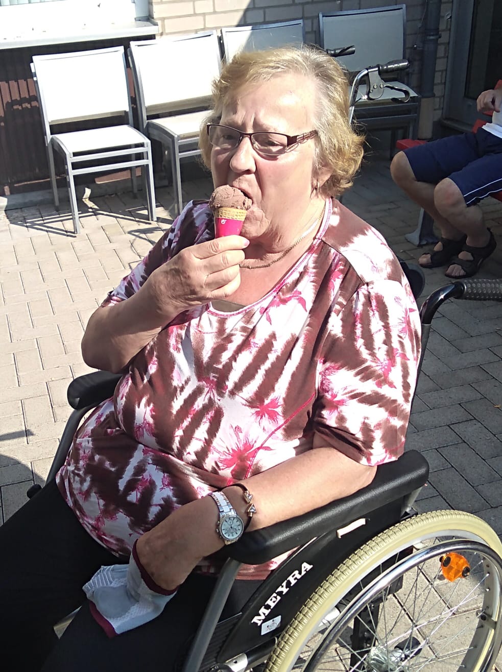 Ein leckeres Eis gehört einfach zum Sommer dazu. Darum gingen an diesem heißen Vormittag Mitarbeiter durch das Pflegeheim um unsere Bewohner mit der kalten Köstlichkeit zu versorgen. Einer Eiskugel in der Waffel konnten bei den Temperaturen nur die wenigsten widerstehen. Schnell erinnerte man sich an den Eiswagen aus der Kindheit, und dass eine Kugel damals noch „20 Pfennig“ kostete.